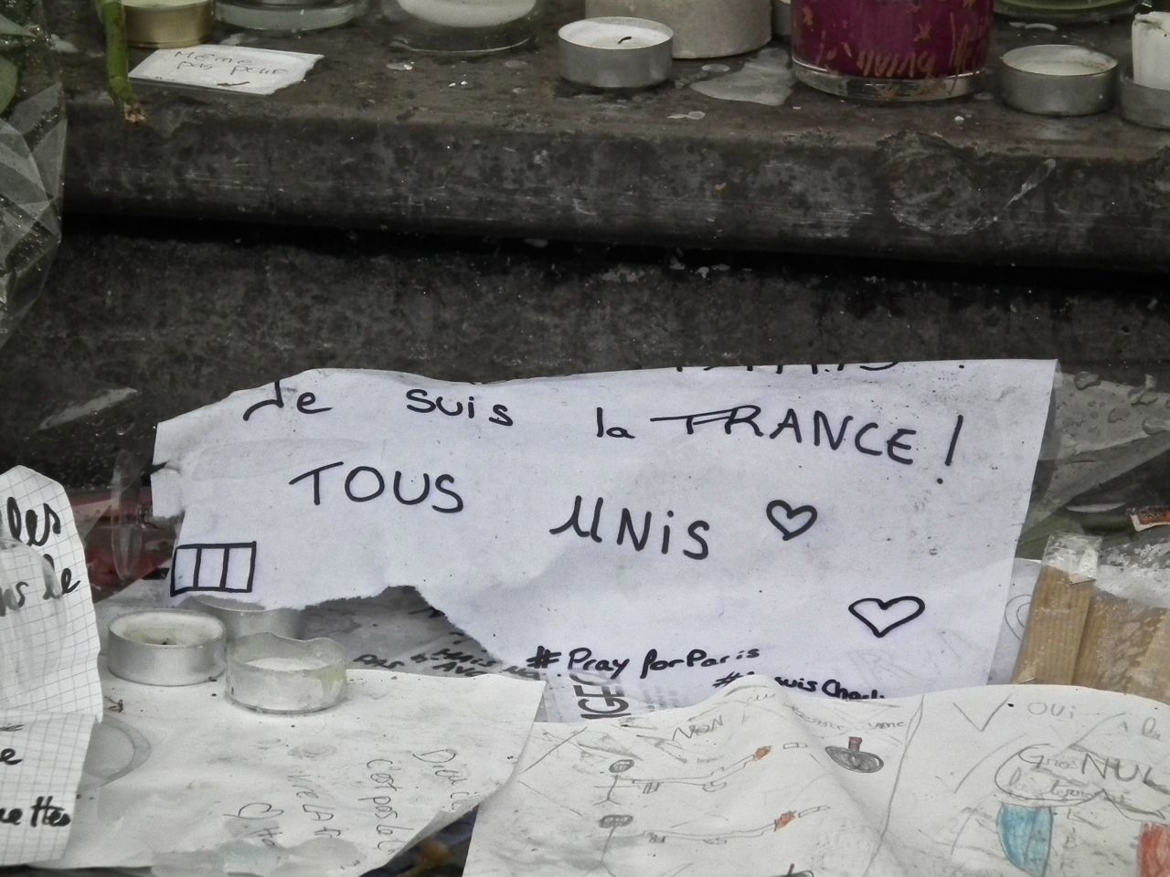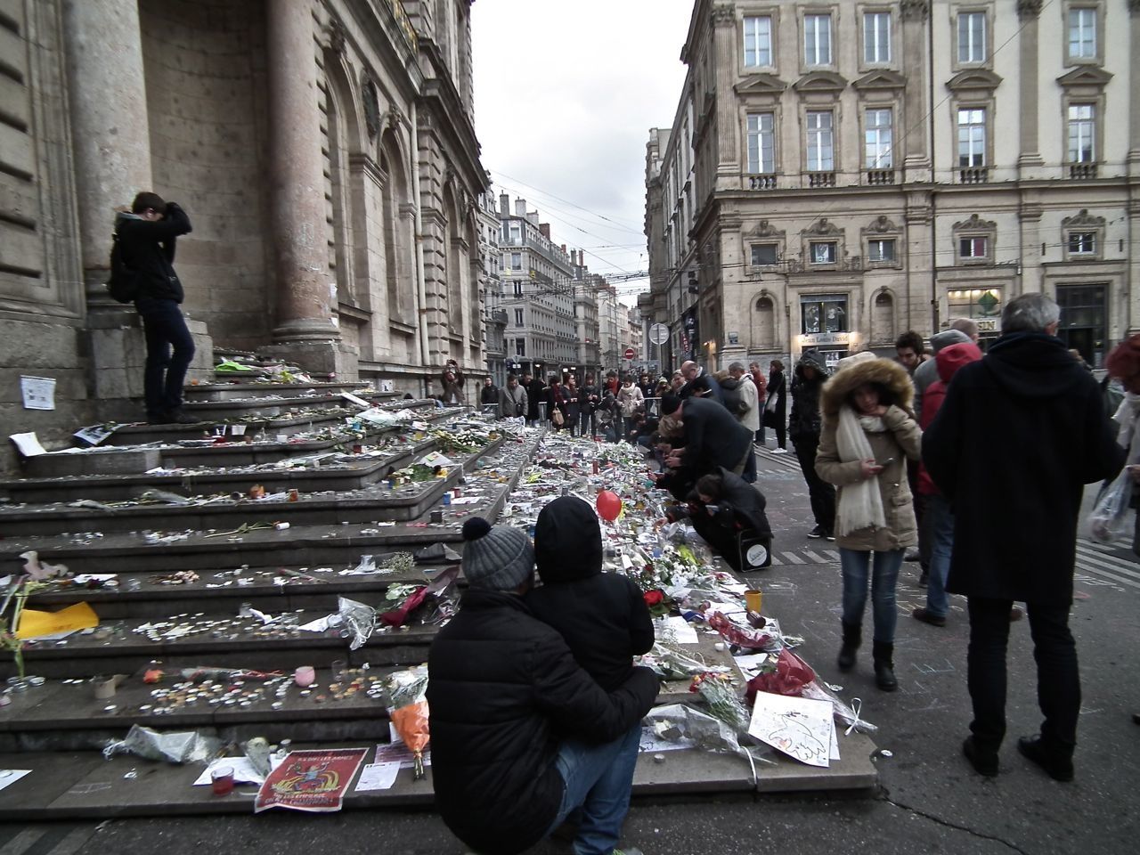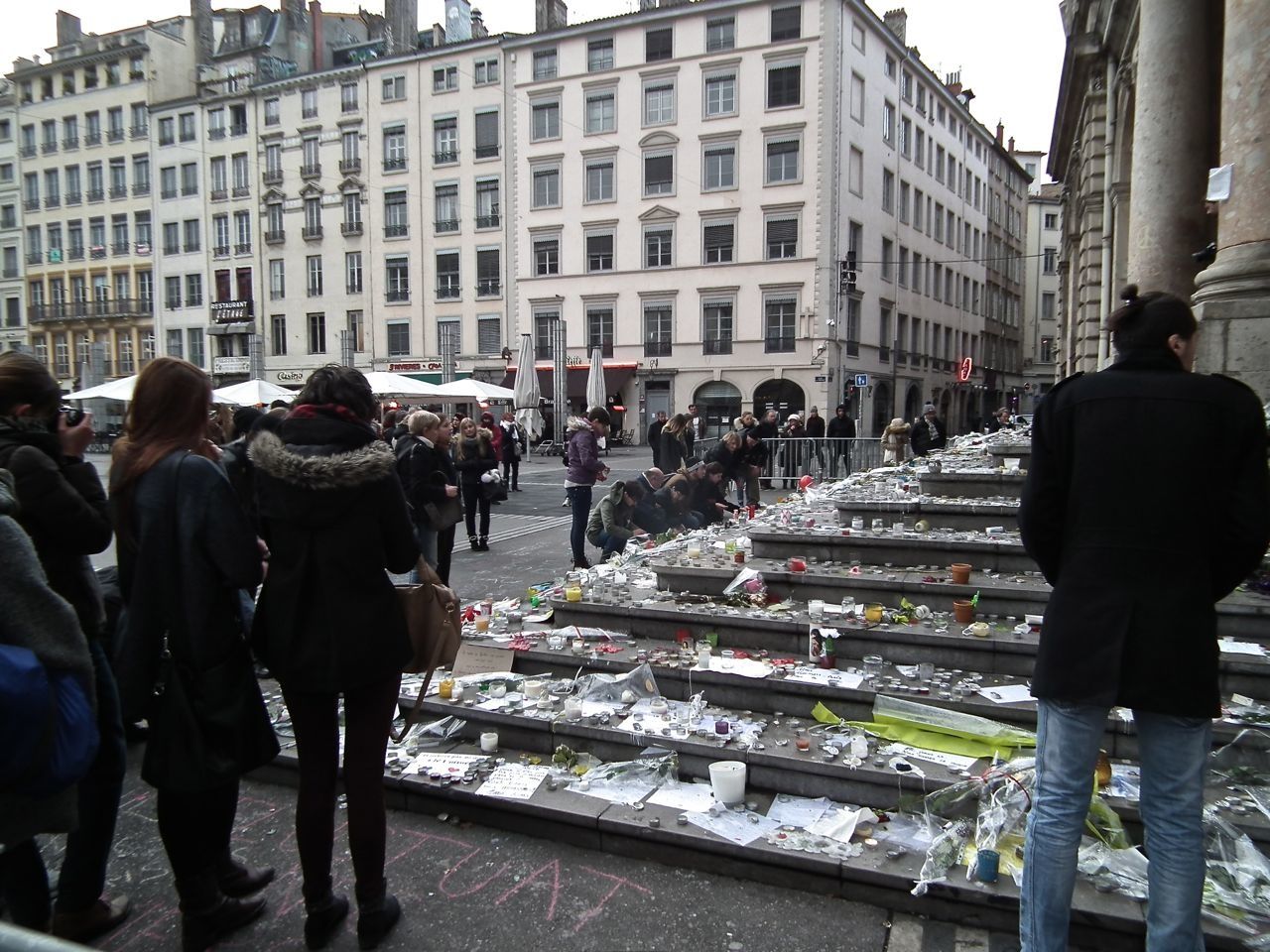 Quelques photos de portes, de chapiteaux de colonnes, et la place… l'émotion, les hommages, sont toujours présents, des gens qui allument, réaniment des bougies, un groupe arrive, quelques mots, et la Marseillaise s'envole.