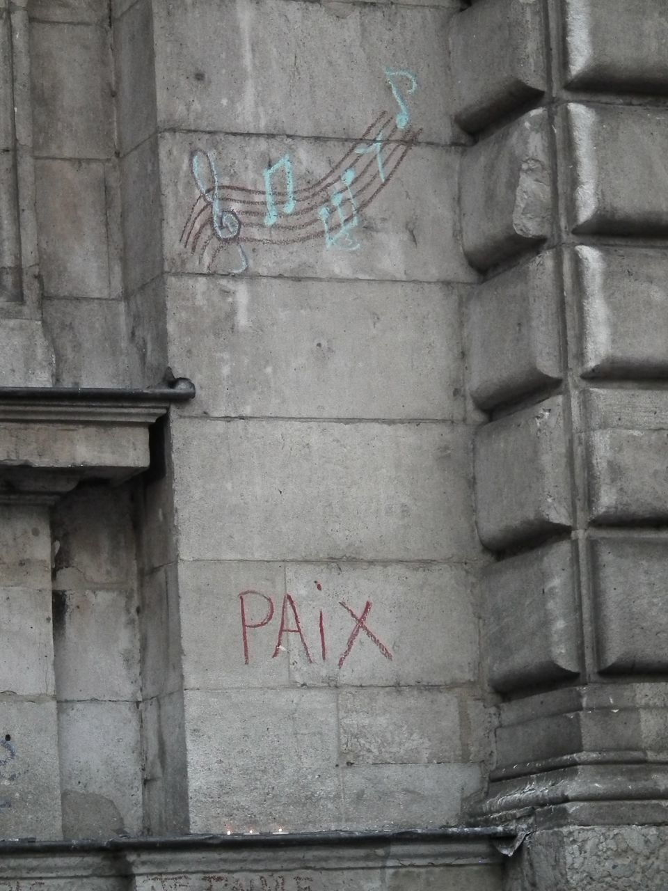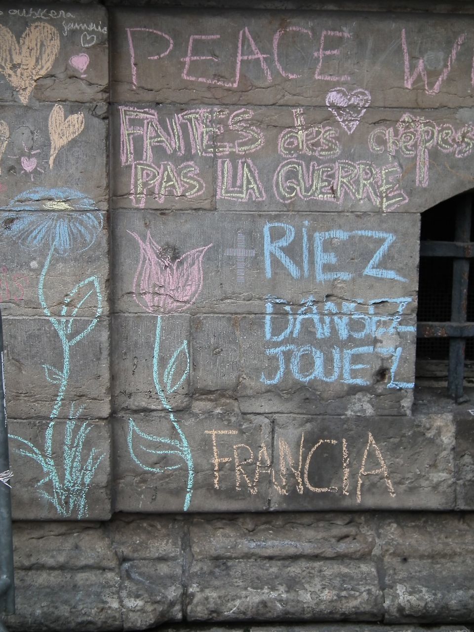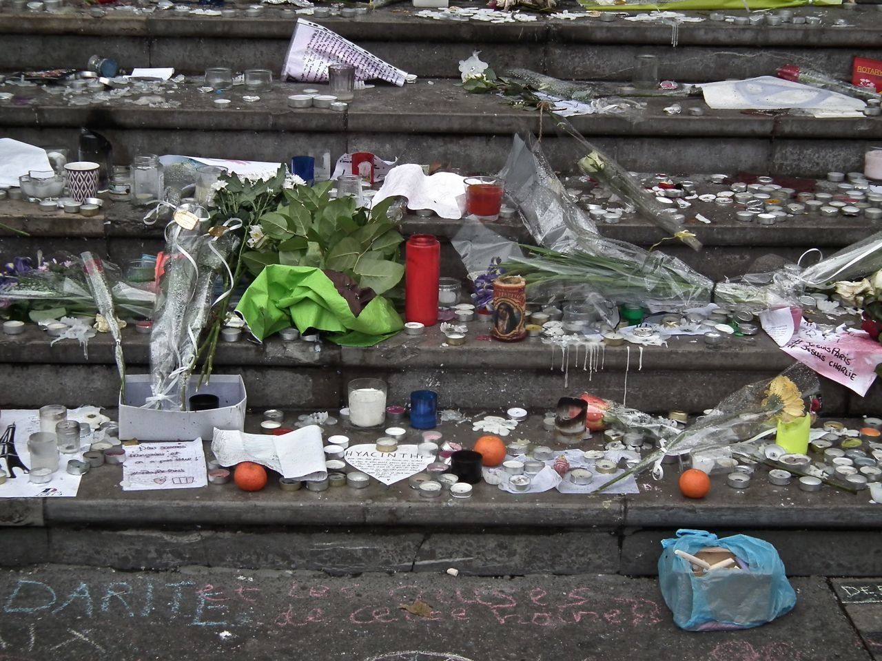 Quelques photos de portes, de chapiteaux de colonnes, et la place… l'émotion, les hommages, sont toujours présents, des gens qui allument, réaniment des bougies, un groupe arrive, quelques mots, et la Marseillaise s'envole.