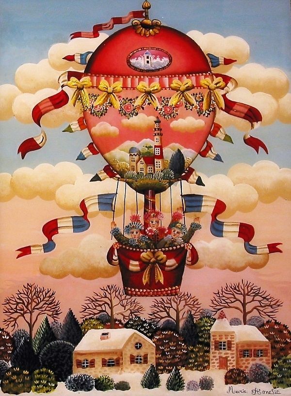 En voyant cette toile, j'ai tout de suite pensé au douanier Rousseau. J'aime beaucoup les détails, la couleur le jeu de saison entre le village et le décor du ballon.